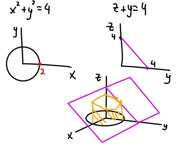 La primera gráfica si la ves desde arriba lo que ves es un circulo de radio 2. Como no depende de z. si haces z=0, 1,2,3,... vas a tener siempre la misma gráfica x^2+y^2=4. Por tanto forma un cilindro. La segunda gráfica por su parte no depende de x, por lo que va a suceder algo similar. Y como depende linealmente de Y y Z, lo que se genera es un plano que lo vemos en morado(o el color que sea...). El volumen por tanto es ese que ves en amarillo. Es un cilindro que tiene un corte diagonal. La integral es