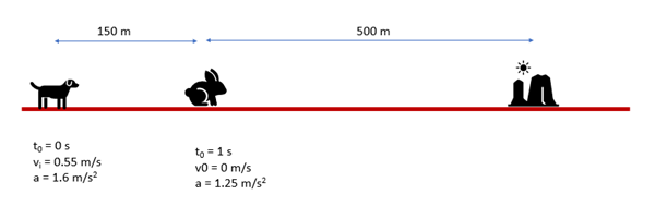 El conejo se percata que lo están cazando y empieza a correr 1 segundo después que el perro empezó a acelerar, si éste tiene su madriguera a 500 metros de donde se encuentra actualmente, y tiene una aceleración de 1.25 m/s2. La diferencia de distancia entre el perro y el conejo era de 150 mtrs antes de que el perro empezara a acelerar.