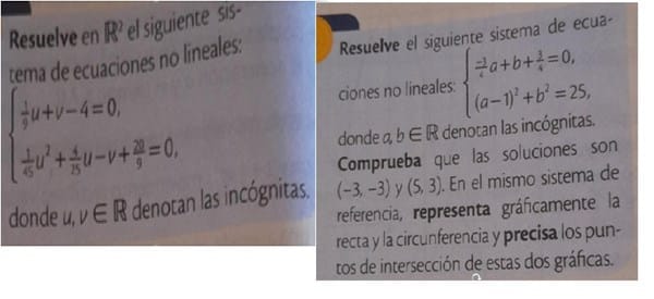 El primero se resuelve en forma similar. Se trata de la interseccion entre una recta decreciente en u y una parabola. Veras que cumplen la interseccion los pares { u, v} = : { -17, 5.9} y {4.726, 3.475}