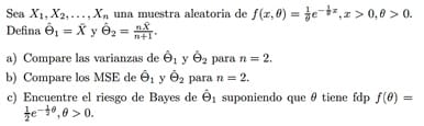El resultado de un experimento es una variable aleatoria X y que f(x; θ) representa su fmp o su f dp. Con base en una muestra aleatoria X1, X2,..., Xn tomada de X (también se dice tomada de f(x; θ)) se estimará o representar´a θ o una función de θ, τ(θ). En general, una función de la muestra resuelve el problema.