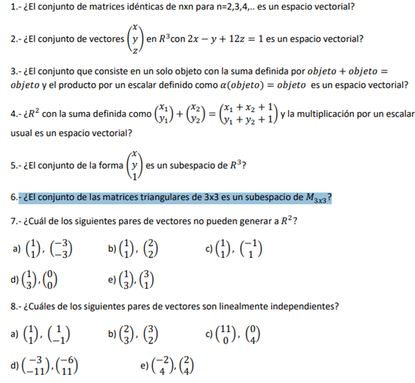 No le entiendo ahora a este tema de espacios vectoriales y de verdad necesito ayuda, si pueden poner procedimiento o el porque de las respuestas lo agradecería muchísimo para comprender más