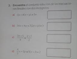 Encuentra el conjunto solución de las siguientes inecuaciones lineal con dos incógnitas: ejercicios a). 5x-4(x-y)>5y