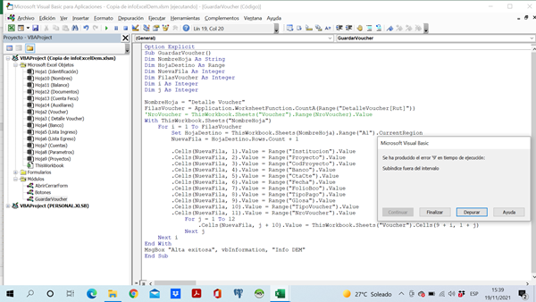 Tengo una macro que copia información de una hoja a otra pero cuando la ejecuto entrega un mensaje que dice: se ha producido el error '9' en tiempo de ejecución: Subíndice fuera del del intervalo.