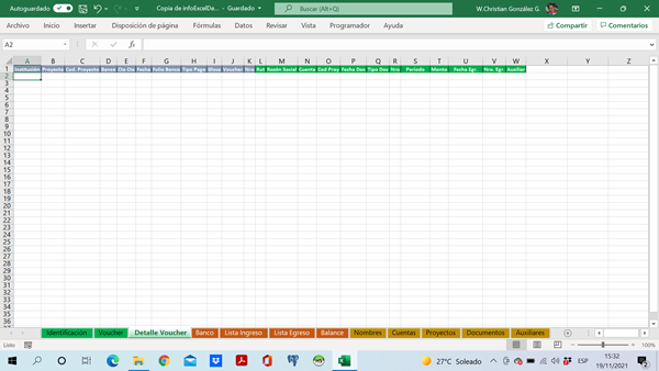 Desde la fila 2 a la 6 son celdas que fueron nombradas como rangos (se les puso nombre a las celdas); en la fila 9 comienza la tabla que contiene 12 columnas. Esta es la información que se copia.