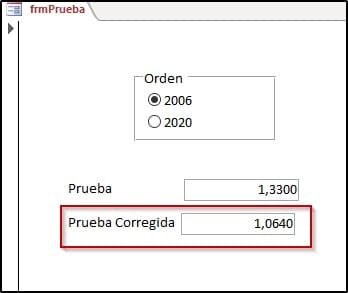 En el mismo formulario tengo insertado tres textbox llamados Prueba, PCorregida y Texto16 (donde realizo un cálculo). Lo que pretendo es que al seleccionar una opción u otra me haga lo que tengo en la siguiente instrucción, la cual la tengo insertada en Al hacer clic: