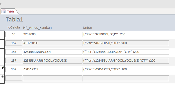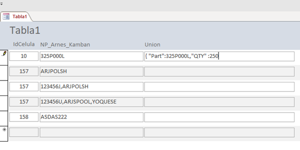 Necesito concatenar 2 campos de distintas tablas con la siguiente sintaxis " {"Part":"1908PVCTERM-A","","Qty":"400"}" donde Part es el numero de parte y QTY es la cantidad pero estas están en dos tablas distintas intente con un campo calculado en mi tbl_kanban pero me faltaría saber como agregar la cantidad que esta depende de la tbl_celulas esto lo necesito para generar un codigo QR y de esta información pero con los datos concatenados