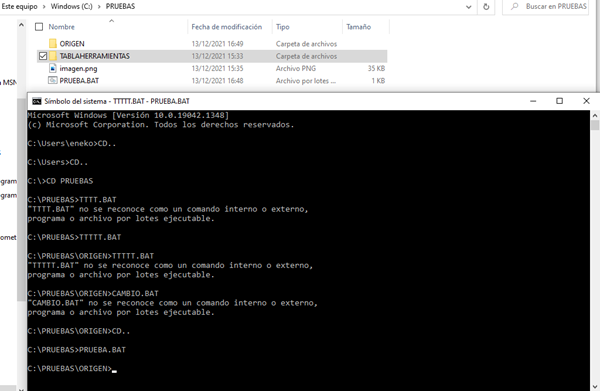 Lo único raro que veo es que una vez ejecuto el bat "PRUEBAS.BAT" no hace lo deseado, pero cambia la ruta de línea de comandos. Se mete en ORIGEN.