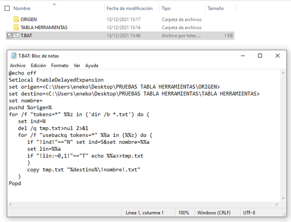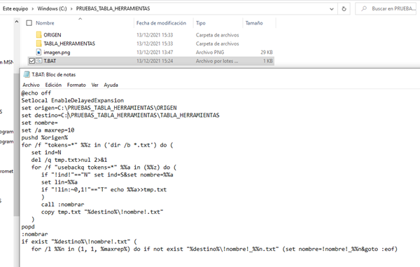 He probado el bat actual, pero no me funciona. En la imagen inferior puedes ver que he ubicado en una misma carpeta del escritorio la carpeta de origen "ORIGEN" y la carpeta destino "TABLA HERRAMIENTAS". También puedes ver el código tal cual lo he dejado, sin el ECHO del final, y con las ubicaciones de destino y origen. Se ejecuta super rápido, pero no hace nada.