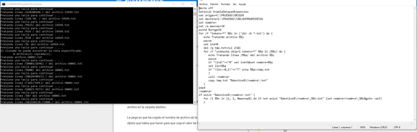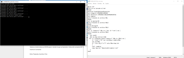 Por tanto seguimos avanzando, pasito a pasito. Ya sabemos que identifica un archivo, de nombre 19999.txt, que se encuentra en C:\PRUEBAS\ORIGEN. El hecho de que no salgan más mensajes de los de dentro del primer FOR me da a entender que el BAT se "pierde" en el tratamiento de ese primer archivo detectado.