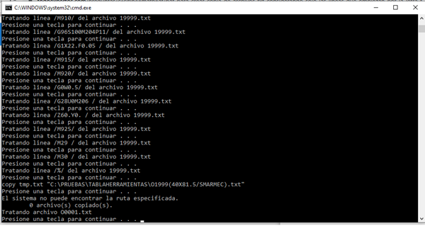 Si no saliera ningún "Tratando línea /.../ del archivo 19999.txt" entonces haz un TYPE 19999.txt para que pueda ver que contiene ese archivo porque ahí estaría el problema.