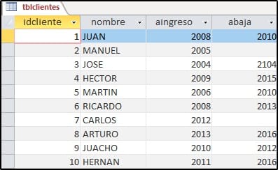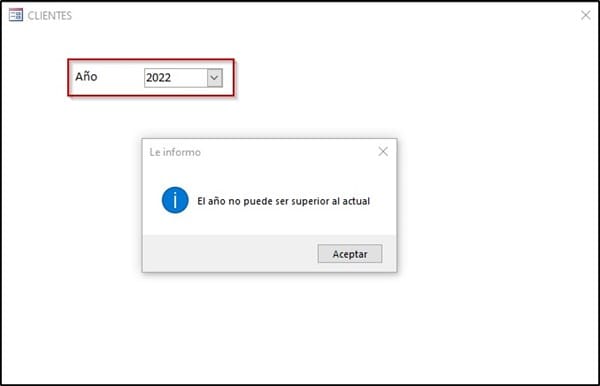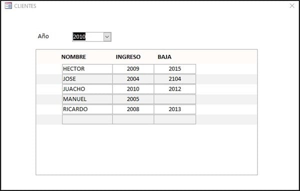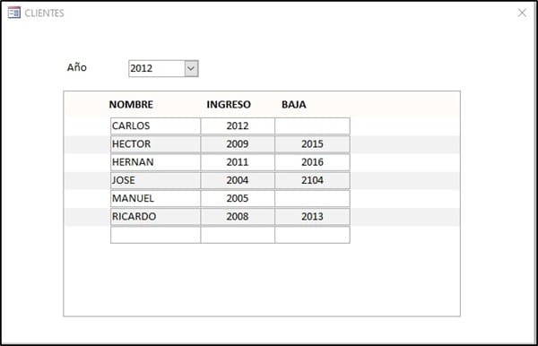 Cuento con un formulario que tiene un cuadro combinado para seleccionar el año a consultar y un subformulario que muestra los clientes vigentes a ese año.