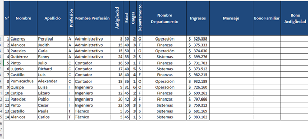 En la hoja llamada EMPLEADOS, complete las columnas “Nombre Profesión” y “Nombre departamento” con los datos de la hoja “Tabla”. En caso de digitar un código inexistente en “profesión” o “departamento”, debe colocar en la respectiva descripción el mensaje “Código Invalido”.
