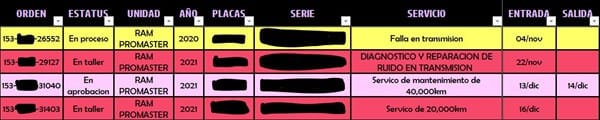 Manejo 2 tablas de excel, en una tienen toda la información que manejo sobre la unidad (imagen 1) en la 2 da tabla es un reporte para saber las unidades que se tienen dentro del taller con mas datos (imagen 2), lo que quiero saber es como puedo hacer que el numero de orden se ponga en la tabla 2 cuando en la tabla 1 cuente con fecha de ingreso, y una vez que se ponga fecha de salida se elimine de la tabla 2.