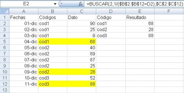 En C quiero el valor del número de la columna C que dependa del código de columna B y que dependa de la fecha de la última compra.