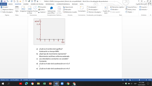 d) Y e) La aceleración vale 0 para cualquier valor de tiempo entre 0 y 5 seg.