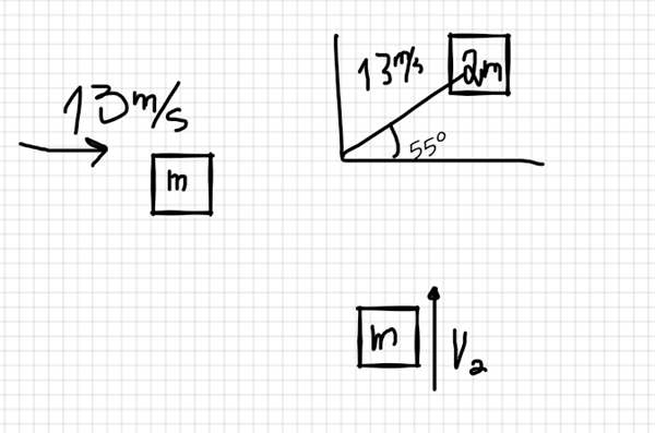 Ambos coches chocan y se quedan unidos con una velocidad final de 13 y una masa "2m" con un ángulo de 55°.
