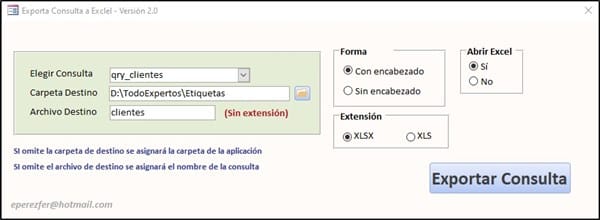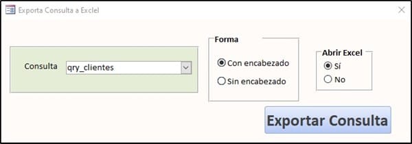 Este formulario recoge todas las consultas de la base de datos y permite elegir si incluye los encabezados y si abre Excel después de exportar. Consta de un procedimiento a nivel de formulario, código en el evento Al abrir del formulario y el código del botón exporta consulta.