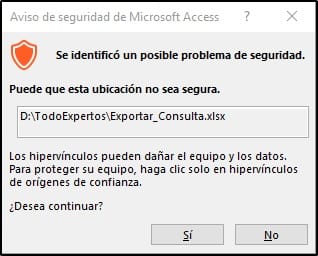 'Declaramos la variable ruta Dim Ruta As String 'Asignamos la ruta de Access a la variable Ruta Ruta = Application.CurrentProject.Path DoCmd.OutputTo ObjectType:=acOutputQuery, ObjectName:="qry_clientes", OutputFormat:=acFormatXLS, _ Outputfile:=Ruta & "\Exportar_Consulta.xls", autostart:=True