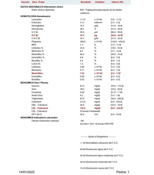 En diciembre me hice una analítica de sangre por rutina. En los resultados sale que los neutrófilos tienen un valor de 7.53 y el limite es de 7.5. También el HCM da un valor de 32.3 y el limite es 32. EL medico de cabecera me dijo que estaba todo bien, pero como esos valores superan en casi nada el limite no se si entra dentro de lo normal. Adjunto la analítica que me hicieron por si puede ayudar. Gracias de antemano.