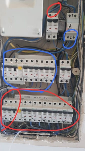 Aquí un foto de todo el panel, todos los automáticos en rojo tienen 230v/230v pero los en azul tienen 0v/0v.