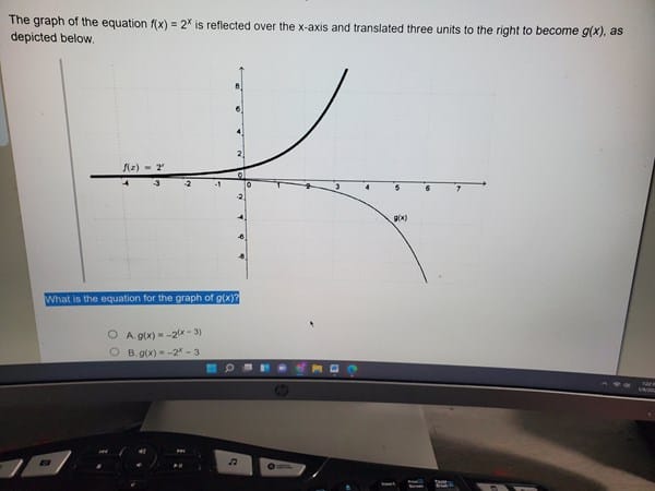 La gráfica de la ecuación f(x) = 2x se refleja sobre el eje x y se traslada tres unidades a la derecha para convertirse en g(x), como se representa a continuación.