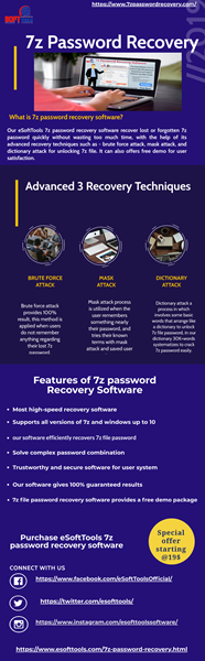 Many times I have trouble opening a password-protected 7z file without a password. Then I found the best solution to recover 7z file password with eSoftTools 7z password recovery software. This works on Windows XP, 7, 8, 10, and onward and recovers any types of 7Z file password like alphabetic, numerical, alphanumerical, and special character. You can download a free trial pack to show the first 3 letters of password.