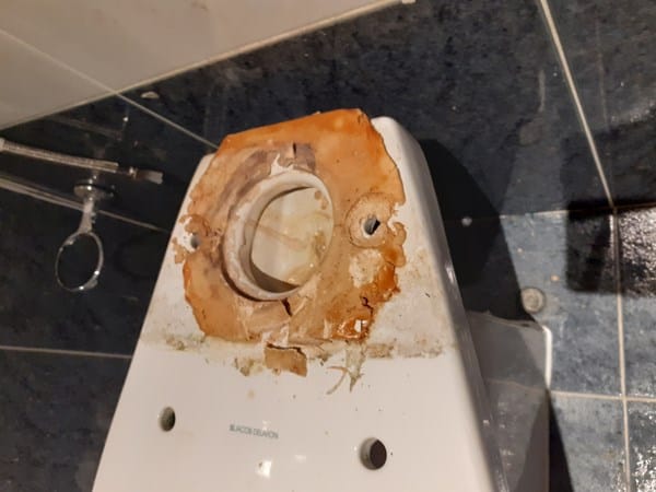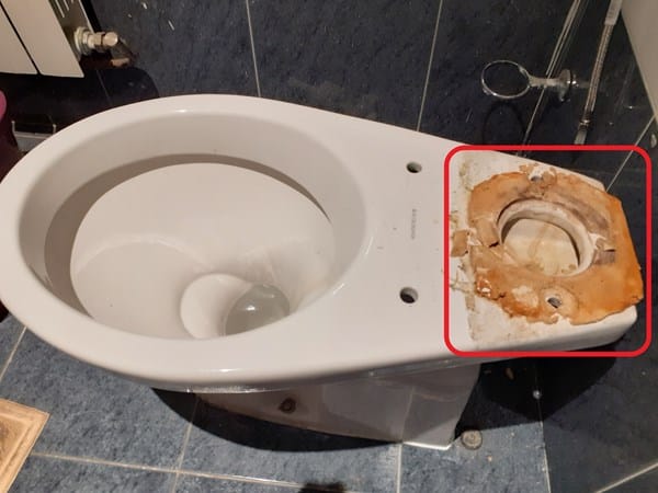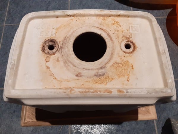 He desmontado la cisterna del inodoro y, en la zona de la taza del inodoro donde se apoya la cisterna me he encontrado una especie de “relleno” marrón (lo que está dentro del recuadro en rojo) supongo que será masilla o algo así. Este inodoro tiene más de 25 años.
