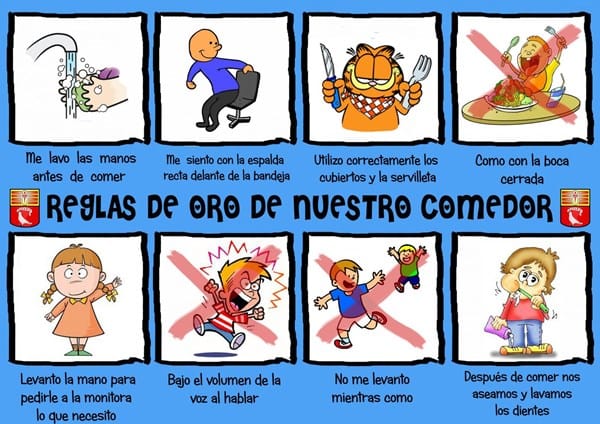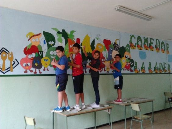 Tienes en internet muchos dibujos o similar que pueden ser pintados en las paredes, con la ayuda de algún profesor, en la de los pequeños, pueden ser frutas y en la de los mayores, la pirámide de los alimentos, por ejemplo. Además de normas escritas, como lavarse las manos, no molestar, no hablar alto, etc.