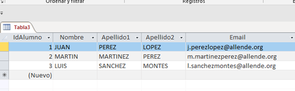 Me gustaría crear los email de mis alumnos-as de forma automática partiendo de los datos de mi base de datos para luego poder subir al dominio todos los datos en formato csv. En access.