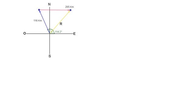 Un barco de turismo zarpa desde una isla en el Atlántico y navega [ 116 Km] con rumbo Noroeste (114º), medidos desde el eje positivo Este. Luego se dirige a otra isla y navega [ 285 Km] hacia el este para llegar a otra isla. ¿Encuentre el vector Posición actual y cual es el angulo respecto al Este se encuentra el Vector Posición?