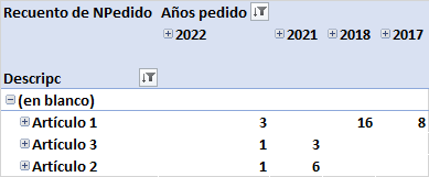 - Se muestra cuántos pedidos se ha hecho de cada artículo cada año