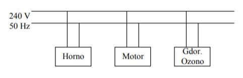 Una fábrica posee tres cargas principales: un motor que entrega 15 HP con un rendimiento del 76 % y un factor de potencia inductivo de 0,78 (1 HP = 746 W), un horno a resistencia que requiere 3KW, y un generador de ozono que requiere 4.5 KVA con un factor de potencia capacitivo de 0,55. La tensión de la línea de alimentación tiene un valor eficaz de 240 V, f = 50Hz. Determinar los valores totales de: