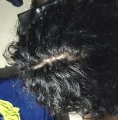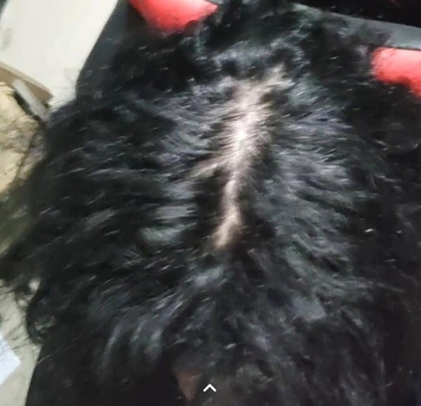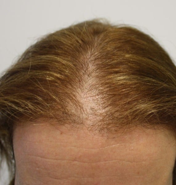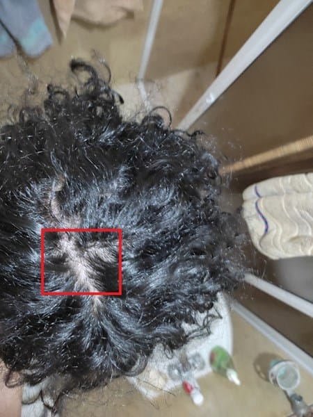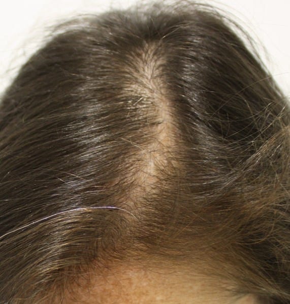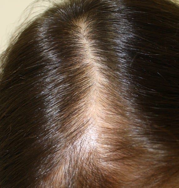 En mi ignorancia encuentro un cierto ensanchamiento en una pequeña área de raya divisoria, pero nada anormal ni preocupante, ya que existe densidad y la luz dá de frente, al menos en mi caso no existe alopecia como tal ni es en principio preocupante.