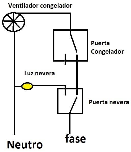 Cada puerta de tu combi tiene un interruptor, el de la puerta de la nevera y el de la puerta del congelador. Esta seria la posición los dos interruptores con las puertas cerradas. El ventilador funciona dado que le llega la fase y el neutro. La luz de la nevera estaría apagada.