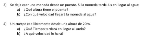 Se deja caer una moneda desde un puente. SI la moneda tarda 4 s en llegar al agua: a) ¿Qué altura tiene el puente? B) ¿Con qué