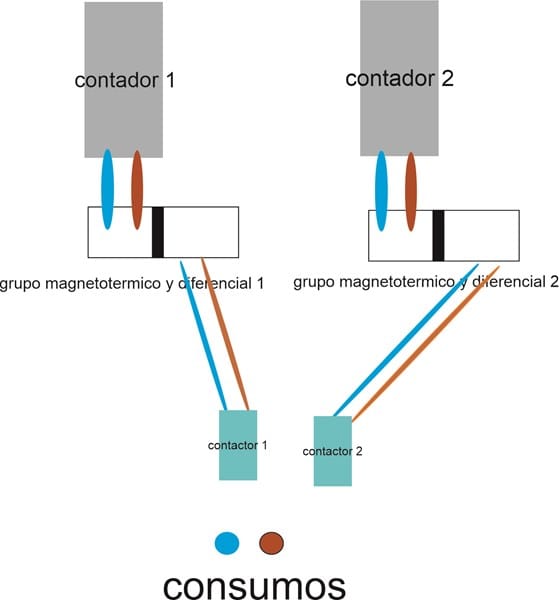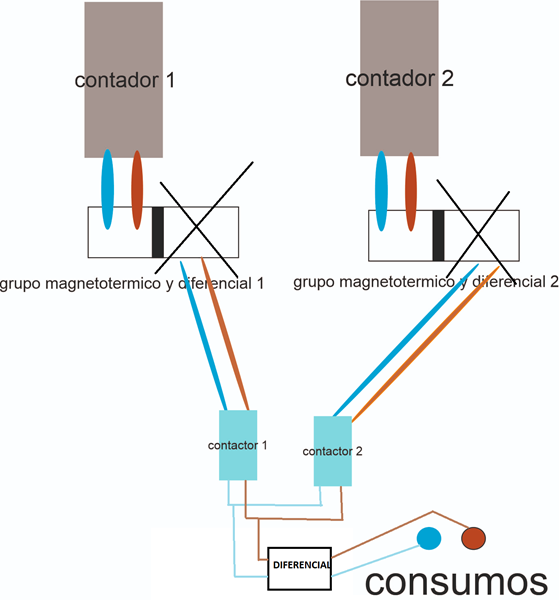 Tengo dos contadores en casa, una historia muy larga, y en uno de ellos tengo paneles solares y me pagan el vertido, pero en las horas que no hay sol la electricidad me sale carísima y lo que quiero es alimentar la casa cuando no hay sol con el contador 2 donde tengo contratada una tarifa menos cara para las horas sin sol. Quiero unir las dos líneas simultáneamente y con un contactor cortar la que no me interese en cada momento. Porque si pongo un contactor para que entre una línea o la otra siempre tendré un microcorte, ¿esto podría absorberlo una batería de condensadores?, ¿O bien hay otro medio más económico de conseguir lo mismo?. Aunque lo ideal sería tener las dos líneas conectadas simultáneamente.