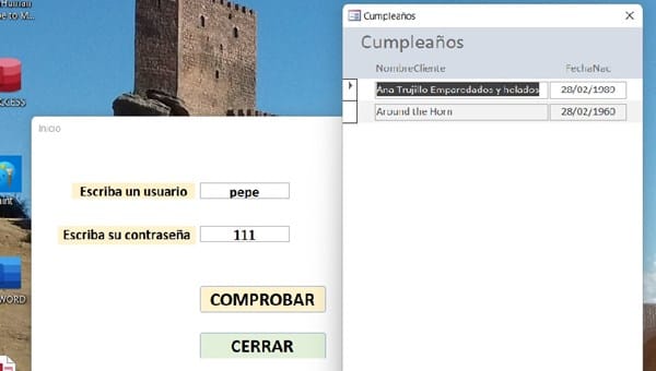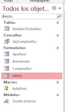 Estoy realizando un proyecto practico de Access, basado una BD que me avise los cumpleaños de las personas que se encuentran en la tabla “NombreFechaNac”. Esta base de dato al abrirse se oculta el entorno de Access y al ingresar a ella me aparece con éxito la lista de los cumpleañeros en los próximos 15 días. Pero no me deja avanzar al formulario “MENU”. Porque se congela el proyecto