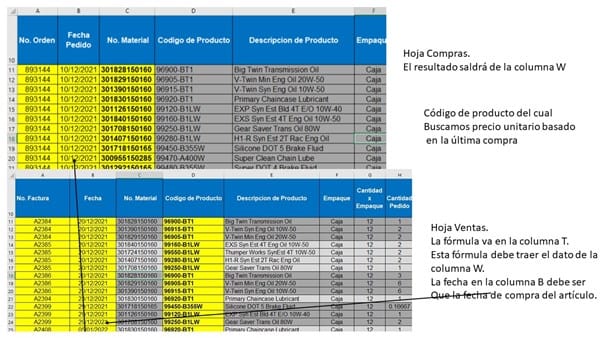A = Orden Compra, B = Fecha de compra, C = Código de producto, W = Dato a encontrar