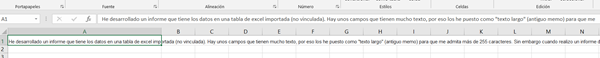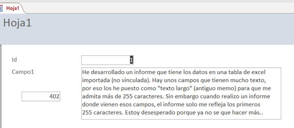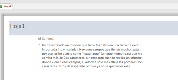 He desarrollado un informe que tiene los datos en una tabla de excel importada (no vinculada). Hay unos campos que tienen mucho texto, por eso los he puesto como "texto largo" (antiguo memo) para que me admita más de 255 caracteres. Sin embargo cuando realizo un informe donde vienen esos campos, el informe solo me refleja los primeros 255 caracteres. Estoy desesperado porque ya no se que hacer más...