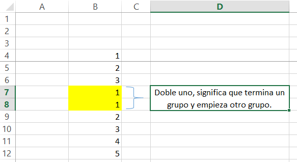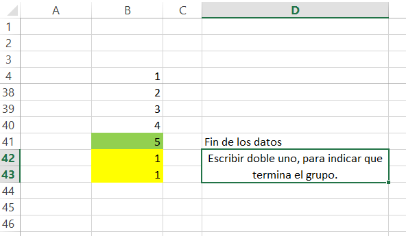 4. Si la fila final de tus datos es el 41, entonces deberás poner un 1 en la celda B42 y otro 1 en la celda B43.