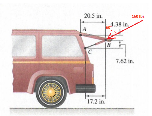 La puerta trasera de un coche se intenta cerrar y en ese momento se encuentra en equilibrio. Si los pasadores en A y en C están fabricados con un material cuyo τúltimo = 20Kpsi. Determine el factor de seguridad de los pasadores. El pasador A tiene un diámetro de 5/16", el pasador C, tiene un diámetro de 1/4", ambos sometidos a cortante doble. Para el cilindro hidráulico BC, calcular el diámetro del vástago si se desea el mismo factor de seguridad de los pasadores y este esta fabricado de aluminio con un esfuerzo ultimo de 36 Kpsi.