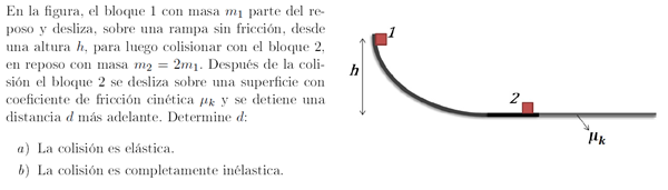 En la figura, el bloque 1 con masa m1 parte del reposo y desliza, sobre una rampa sin fricción, desde una altura h, para luego colisionar con el bloque 2, en reposo con masa m2 = 2m1. Después de la colisión el bloque 2 se desliza sobre una superficie con