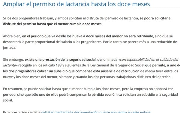 La ley contempla que cuando ambos progenitores, adoptantes, guardadores o acogedores ejerzan este derecho con la misma duración y régimen, el permiso puede extenderse desde los 9 hasta los 12 meses de vida del bebé, con la reducción proporcional del salario y que para complementar la reducción de salario, se puede pedir una prestación en el INSS por ejercicio corresponsable del cuidado del lactante, que consiste en un subsidio diario equivalente al 100% de la base reguladora establecida para la prestación por incapacidad temporal en proporción a la reducción que experimente la jornada de trabajo.