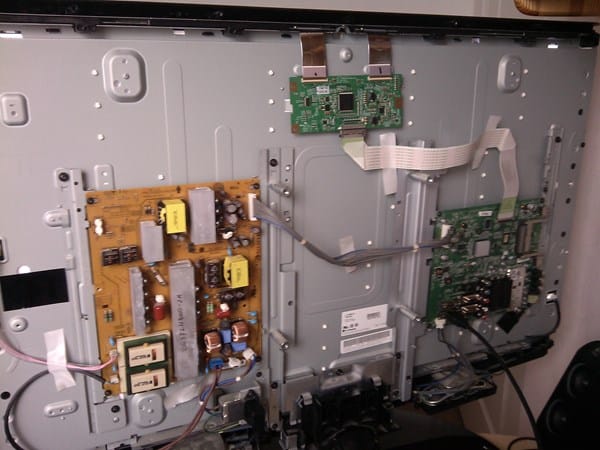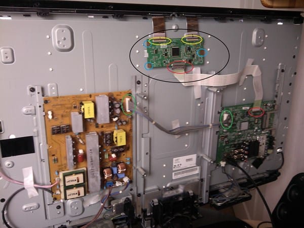 Si no es esto el disipador de aluminio que hay en el medio de la placa base, podría haber perdido la pasta térmica y recalentarse, Para saber si fuera eso, tendrías que poner tu TV sin la tapa trasera y detrás del TV un ventilador que ventile bien este disipador, si de esta forma, no da el problema, seguramente quitando el disipador y poniendo de nuevo pasta térmica, se solucionaría el problema. Pero mejor empezar por los conectores, es mucho más probable.