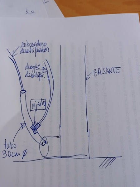 Había pensado poner la salida del rebosadero del descalcificador directamente en la boca de arriba del tubo de 30 cm y la salida del desagüe del descalcificador unos 20-30cm más abajo del mismo tubo mediante un injerto.