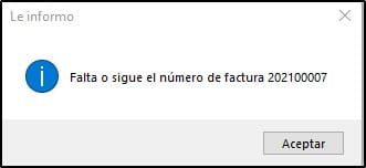 Me informa que falta o sigue el número de factura "202100004", efectivamente la que aparece resaltada en la primera imágen. Hago clic en Aceptar y me pregunta: