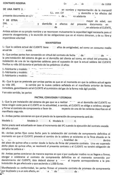 Hace más de 5 años, en mi localidad se hizo obra en todas las calles para introducir el gas natural. En aquel momento, teníamos la oportunidad de dejar las tomas dentro de nuestra casa por muy poco dinero, ya que el coste de introducirlo estaba en aquel momento subvencionado por Gas natural con 150 € y la empresa que actúo de intermediaria con otros 50, a cambio de cumplir ciertas condiciones que ya se cumplieron en su momento. Además de todo lo anterior también firmamos un contrato de reserva por 15 años por nos comprometíamos con la empresa intermediaria a contratarle la instalación de una nueva caldera en el momento que se rompa la nuestra.