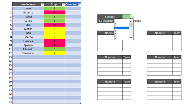 Se puede ver que según el numero me forma los equipos al azar, claro que como involucra un aleatorio no puedo tocar mas nada porque los cambia. Tengo que formar 6 equipos con nombre y team. Pero extraerlos según numero y nombre correspondiente en el cuadro de la derecha es otra cosa, no logre que funcionara.