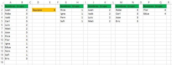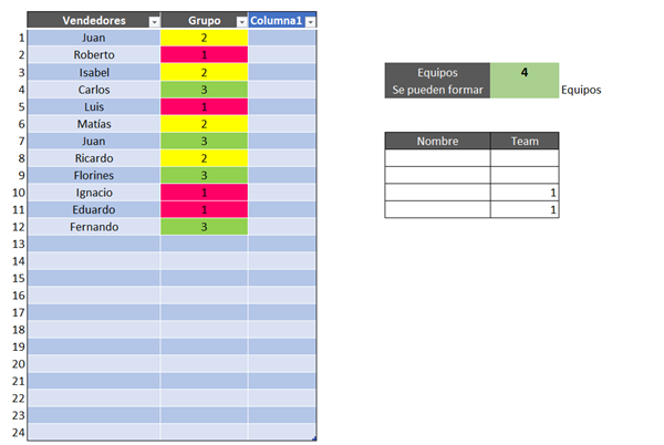 Tengo una tabla con nombres y tengo que generar grupos al azar según criterios, por ejemplo equipos de 2, 3, 4, etc. Y extraerlos por equipos a otras tablas y no puedo lograr, logre que según el numero me los agrupe en un numero pero el agruparlos no se que hacer...