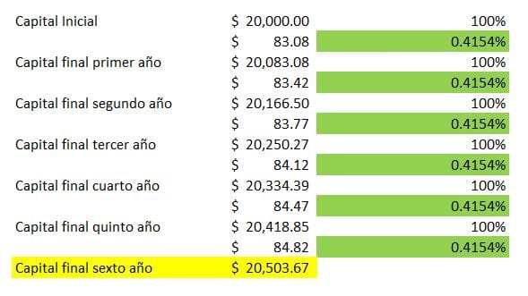 Deposita $20.000 en un banco que garantiza un tipo de interés compuesto anual i pasados 6 años recibe $20.503,67 Se pide calcula
